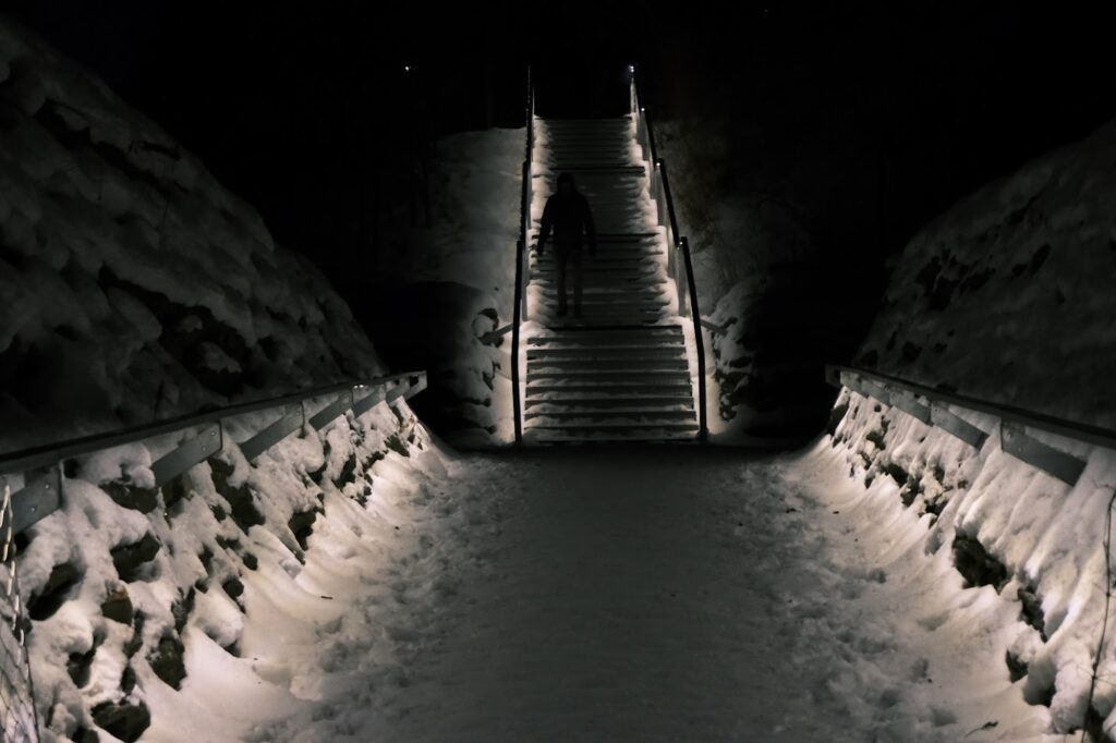 nocne schody ciemna postać schodzi w śnieg mroźna cisza