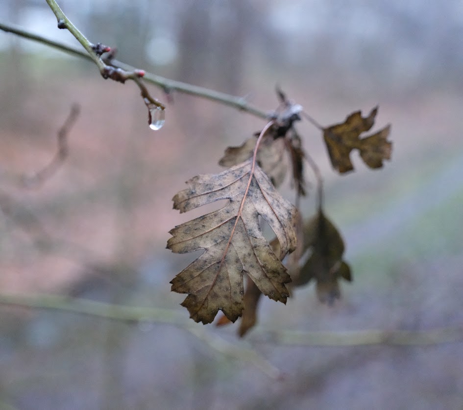 Kropla na dębie, Zeschły liść drży na wietrze, Szary czas czeka.